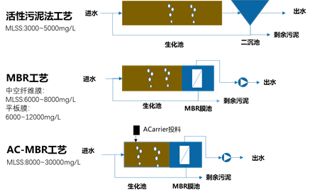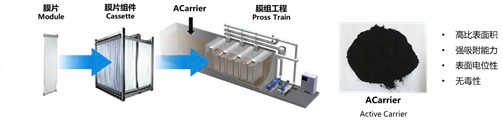 Membrane Bioreactor)活性載體膜生物反應(yīng)器,它是一種投料活性污泥法與膜生物反應(yīng)器相結(jié)合的工藝,即復合MBR技術(shù),一方面通過向生化池中投加活性載體(AC)對系統(tǒng)產(chǎn)生顯著影響,改變系統(tǒng)內(nèi)生物多樣性以及微生物的存在方式,改變基質(zhì)的分配與傳質(zhì)狀況,增加系統(tǒng)的生物固體總量,構(gòu)建懸浮生長與附著生長的“雙泥”共生微生物系統(tǒng);另一方面,利用膜實現(xiàn)泥水分離,代替?zhèn)鹘y(tǒng)二沉池,從而實現(xiàn)高效的固體固體截留,提升整個系統(tǒng)的凈化能力。