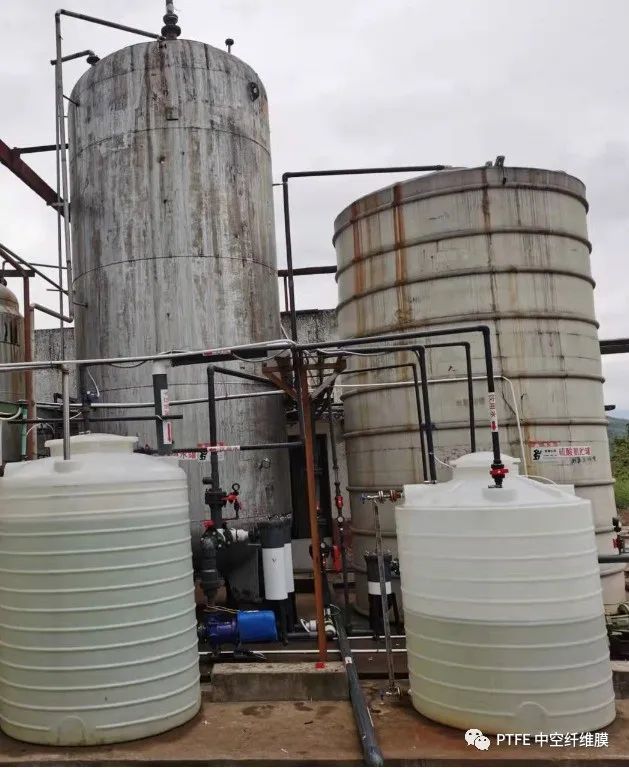來水首先進(jìn)入原水罐,在原水罐內(nèi)通入蒸汽加熱使得廢水溫度滿足脫氨裝置要求,隨后由原水泵(出水母管加裝管道混合器加堿調(diào)節(jié)廢水pH)提升經(jīng)原水保安過濾器保護(hù)性過濾后(共二級,精度分別為10μm、1μm)送入PTFE中空纖維膜脫氨裝置(三級)進(jìn)行氨氮脫除,脫氨后產(chǎn)水送至后續(xù)處理部分。